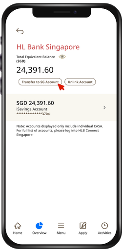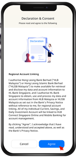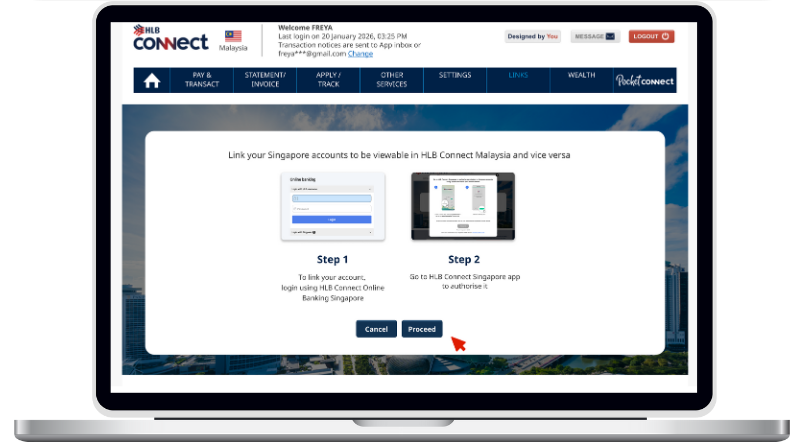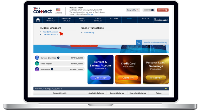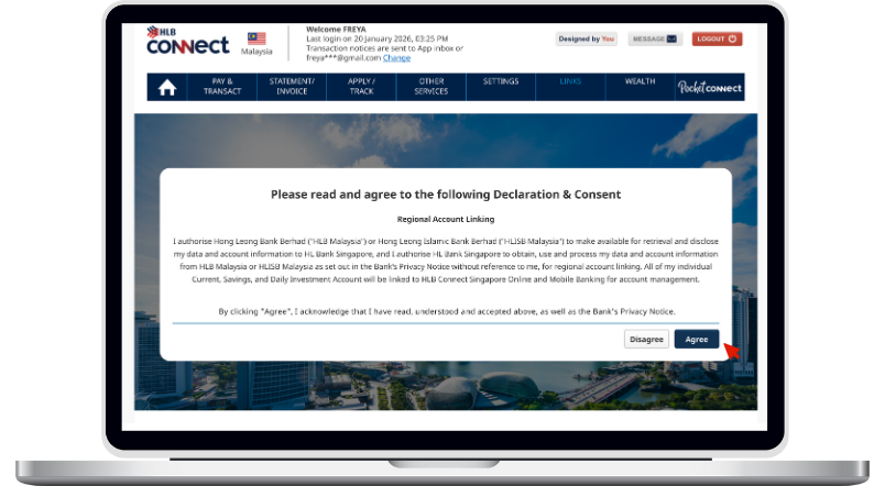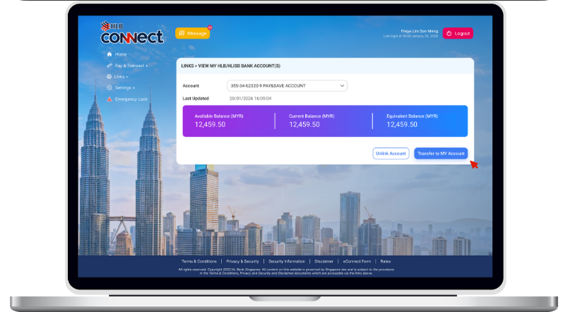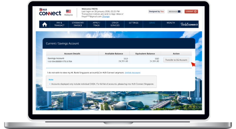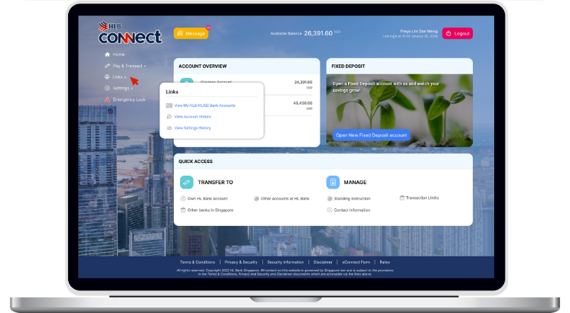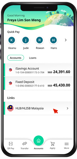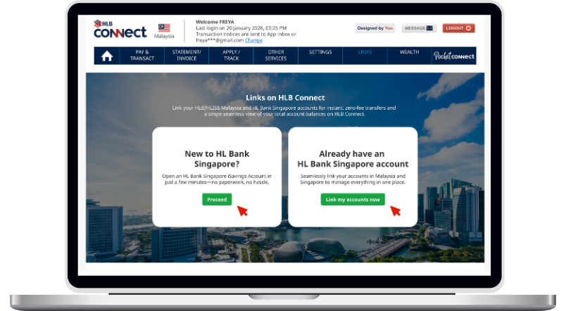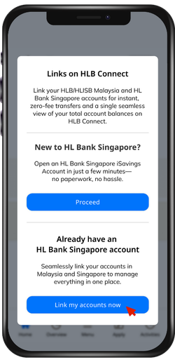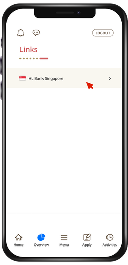 Through HLB Connect Malaysia, link your HL Bank Singapore account with Links.