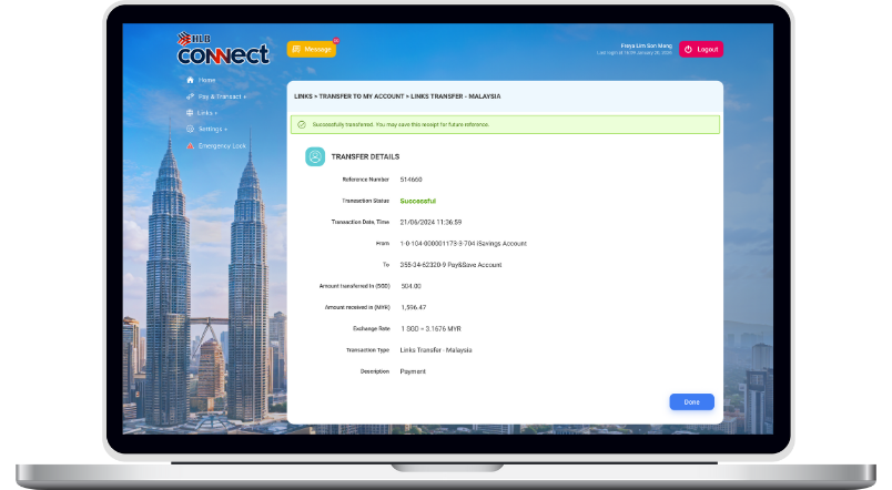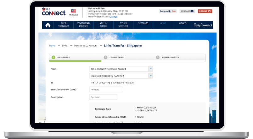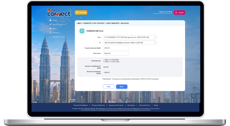 Transfer funds from your Malaysia bank account into your Singapore bank account easily through HLB Connect Malaysia.
