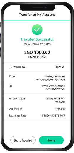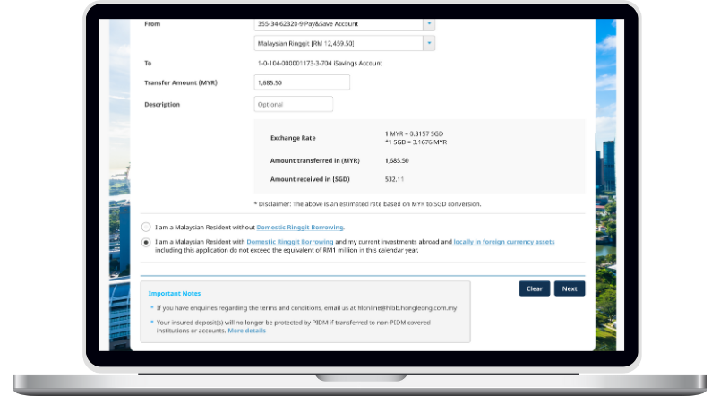 You can also transfer funds from your Singapore bank account into your Malaysia bank account through HLB Connect Singapore.